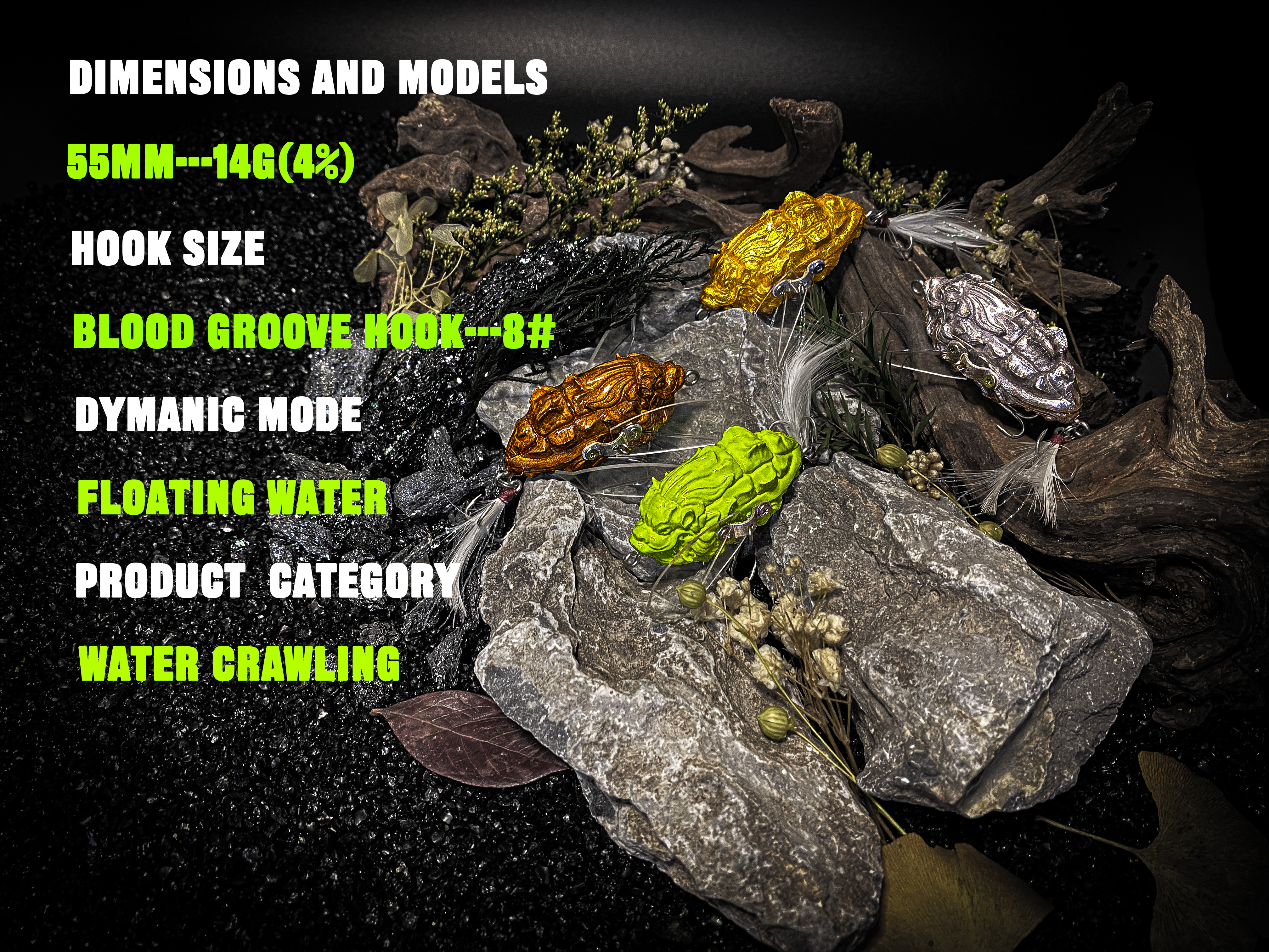 dynamischer Modus, Wasserkriechen, schwimmendes Wasser; Abmessungen und Modelle 55 mm – 14 g (4 %); Hakengröße: Blutrillenhaken – 8 #