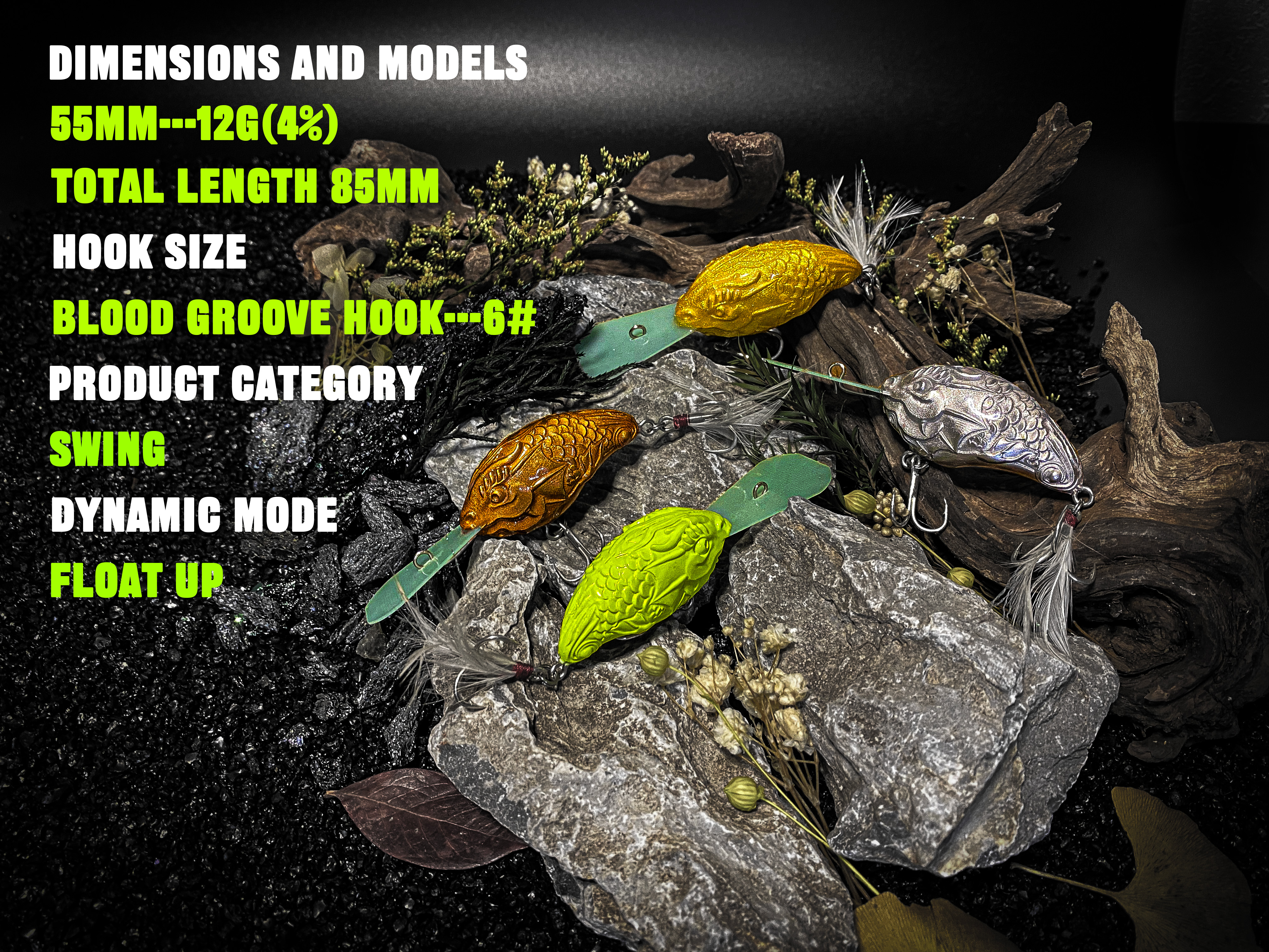 dynamischer Modus, Auftrieb; Tauchtiefe 3 bis 4 Meter; Abmessungen und Modelle 55 mm – 12 g (4 %), Gesamtlänge 85 mm; Hakengröße: Blutrillenhaken – 6#